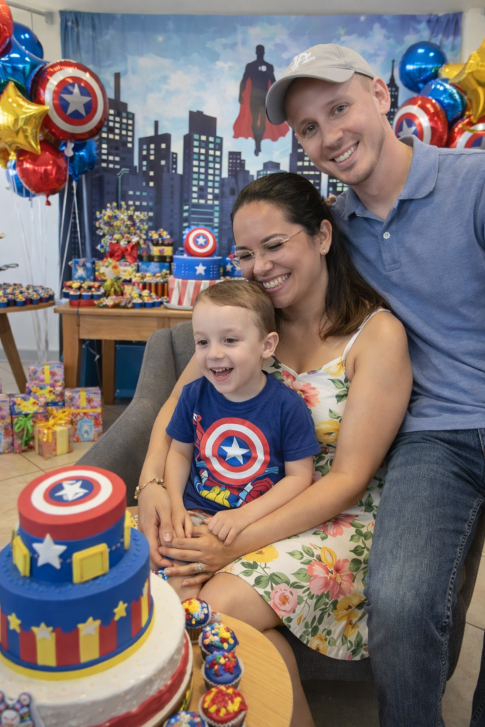 A criança: Sentada no colo da mulher, virada para o bolo, com os olhos brilhando de felicidade. Ele usa uma camisa com estampa de super-herói (ex: Capitão América) e bermuda colorida. Nos pés, tênis infantis.