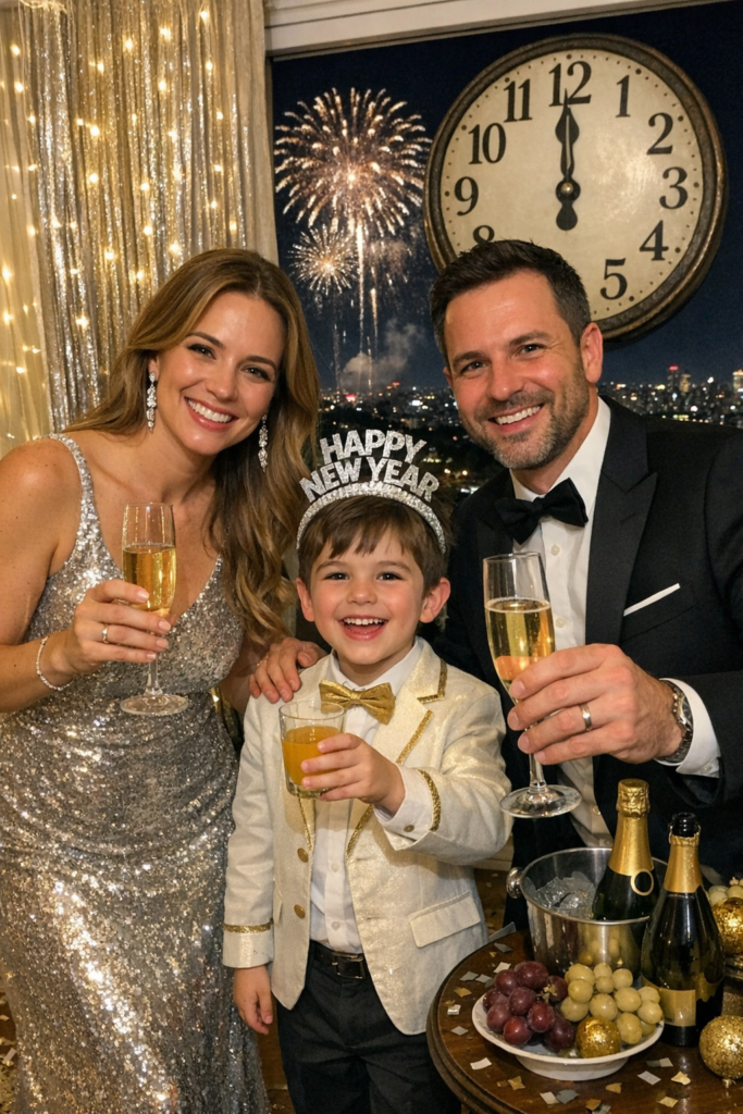 Crie uma foto de estilo lifestyle, capturada com a estética de um iPhone 13, que pareça natural, realista e sem edição, celebrando a virada de Ano Novo em família. Pessoas em Destaque: A mulher: Em pé, ao lado da criança, com um braço gentilmente no ombro dela. Ela usa um elegante vestido longo prateado com lantejoulas, brilhando sob a luz ambiente. Seus acessórios incluem brincos pendentes de cristal e um bracelete delicado. Ela sorri radiantemente, brindando com uma taça de champanhe. O homem: Em pé, ao lado da mulher, em um terno preto clássico com gravata borboleta. Ele segura uma taça de champanhe, sorrindo e olhando para a câmera. A criança: Vestindo um conjunto de festa branco e dourado, com uma tiara brilhante de Ano Novo. Ele está entre os pais, com um pequeno copo de suco, imitando o brinde, com uma expressão de alegria contagiante. Cenário e Decoração: Um ambiente de festa de Ano Novo sofisticado, com vista para uma cidade iluminada e fogos de artifício ao fundo. Decoração: Fundo com cortinas de luzes douradas e prata, confetes espalhados sutilmente no chão. Relógio: Um grande relógio de parede marcando “meia-noite” como um elemento simbólico. Mesa de Brindes: Uma mesa lateral com garrafas de champanhe, taças e frutas decorativas. Iluminação: A iluminação é festiva e brilhante, com reflexos de luzes e brilho de fogos de artifício entrando pela janela, criando um ambiente mágico e esperançoso. Use como base a foto em anexo para os rostos
