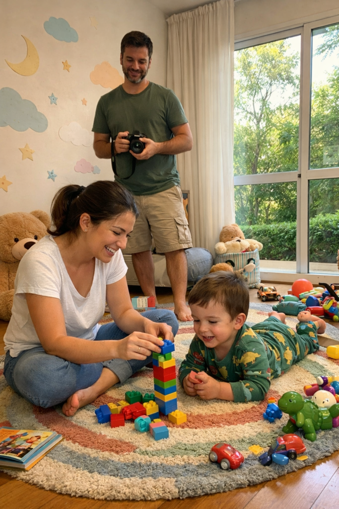 Iluminação: A iluminação é suave e natural, vinda da janela, criando um ambiente acolhedor e feliz, ideal para a brincadeira infantil.
