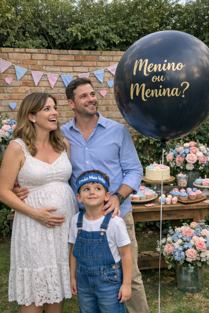 Balão de Revelação: No centro da cena, um grande balão preto com a pergunta “Menino ou Menina?” escrito em dourado, prestes a ser estourado.