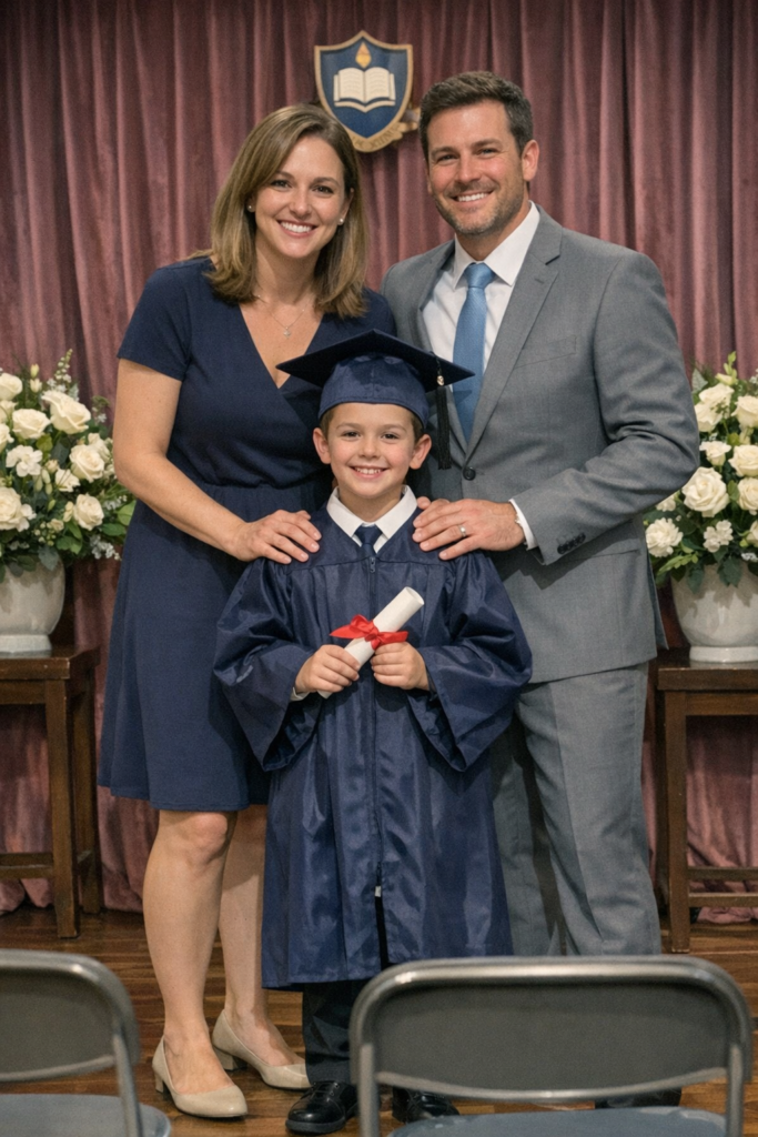 Iluminação: A iluminação é focada e brilhante, como a de um evento escolar, destacando a criança e seus pais no palco, transmitindo a emoção do momento da formatura.