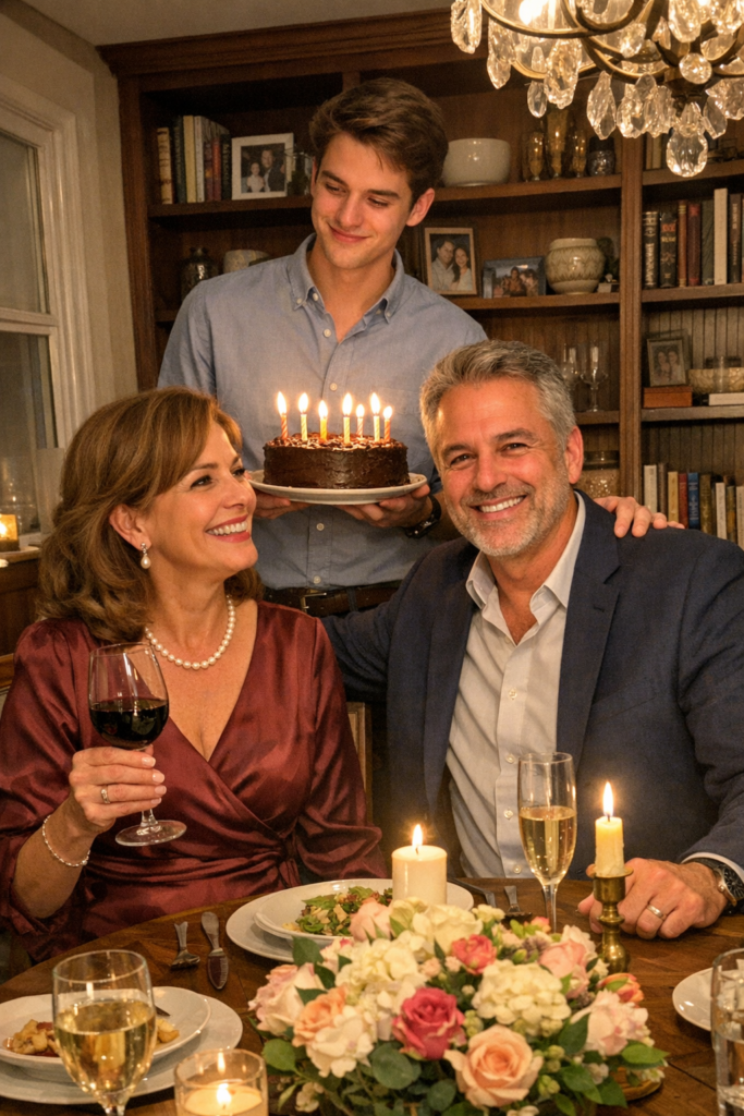 A criança (se houver, como filho adulto/adolescente): Em pé, atrás dos pais, com um bolo de aniversário nas mãos, com velas acesas, olhando para os pais com carinho. Ele usa uma camisa social e calça jeans escura.